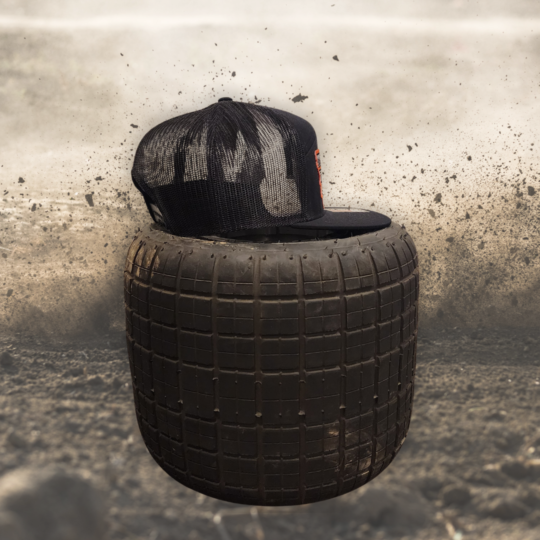 "The Podcast Hat." The Scrubbin' Tires Media - Throwin' Sliders Podcast patch paired with a Richardson 168 7-Panel Trucker Hat in the black and black colorway.