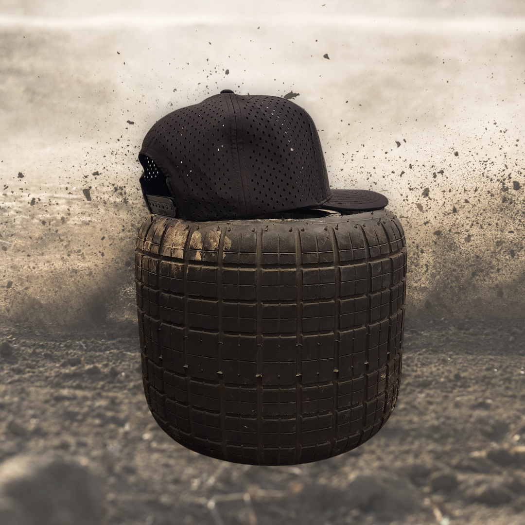 "The Podcast Hat." The Scrubbin' Tires Media - Throwin' Sliders Podcast patch paired with a Zapped Blackhawk 5-Panel Premium Trucker Hat in the black and black colorway.